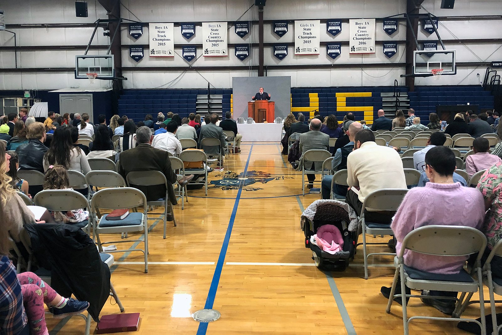 Pastor Douglas Wilson speaks before Communion during a Christ Church service in the Logos School gymnasium on Oct. 13, 2019, in Moscow, Idaho. (Photo by Tracy Simmons, File)