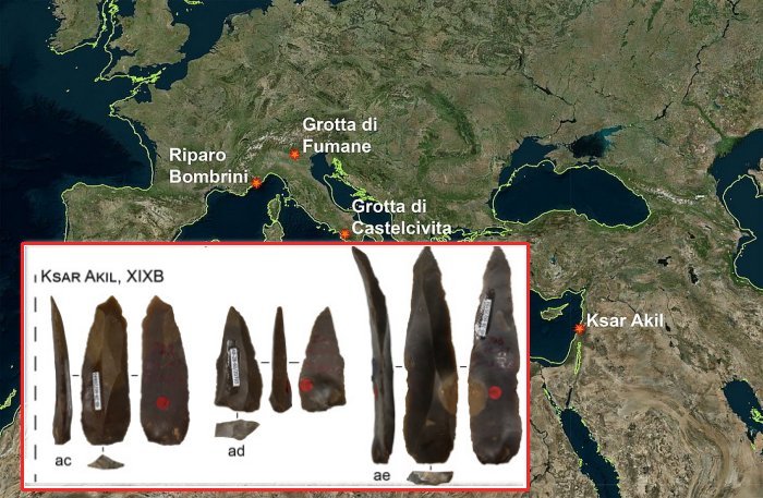 The worked Protoaurignacien stones for the comparison came from three sites in present-day Italy: the Grotta di Fumane near Verona in the northeast, the Riparo Bombrini near Ventimiglia in the northwest, and the Grotta di Castelcivita near Salerno in the south.