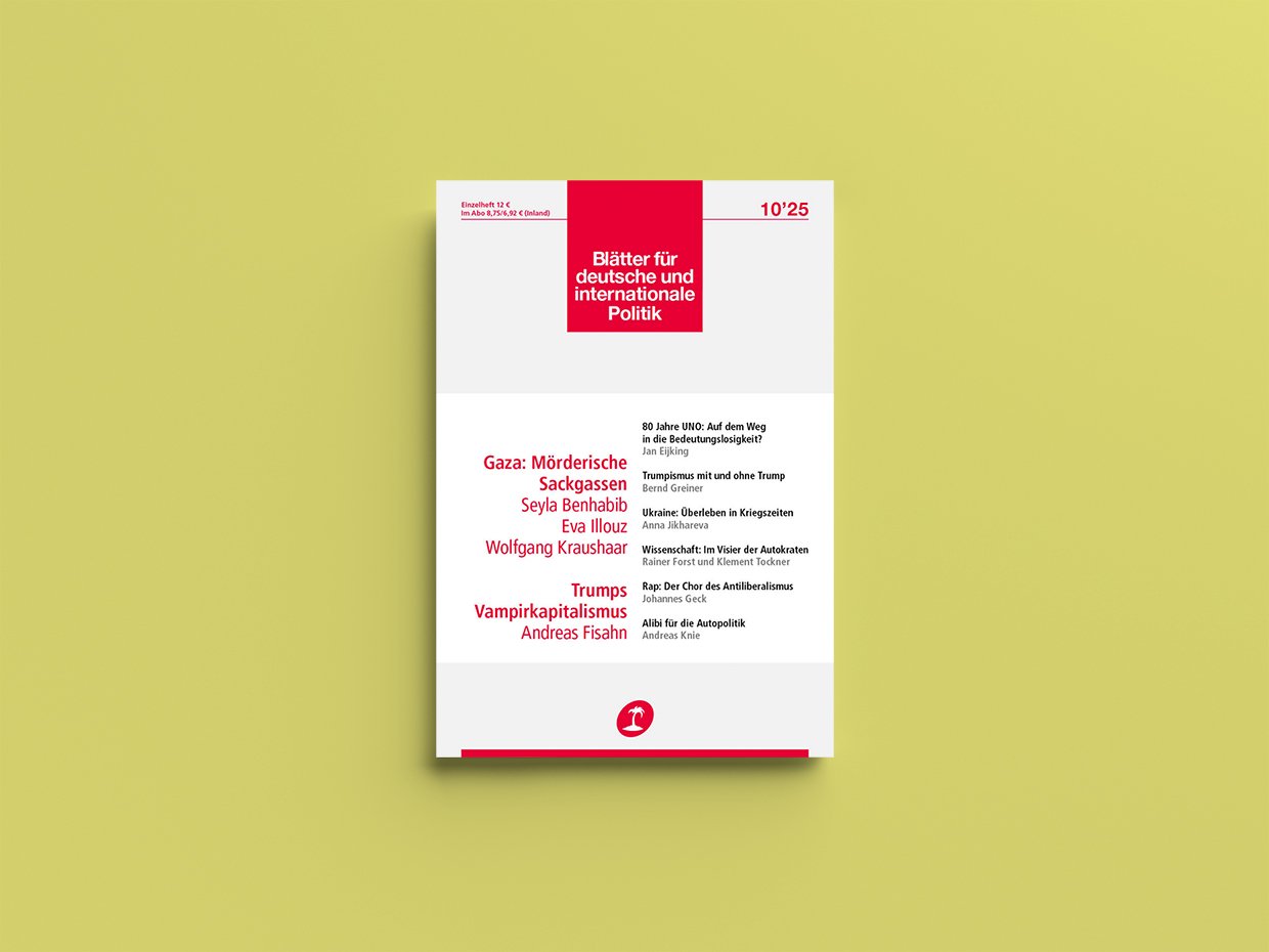 In Blätter, Seyla Benhabib writes that Israel’s war on Hamas reflects three significant shifts in international relations: first, protectionism, imperialism and expansionism replacing globalisation, particularly in the invasion – or threats of invasion – by Russia, the United States, China and Israel. This is often justified in ways reminiscent of the Lebensraum ideology of the early 20th century, with its ‘racialized and exclusionary vision of national identity’.
