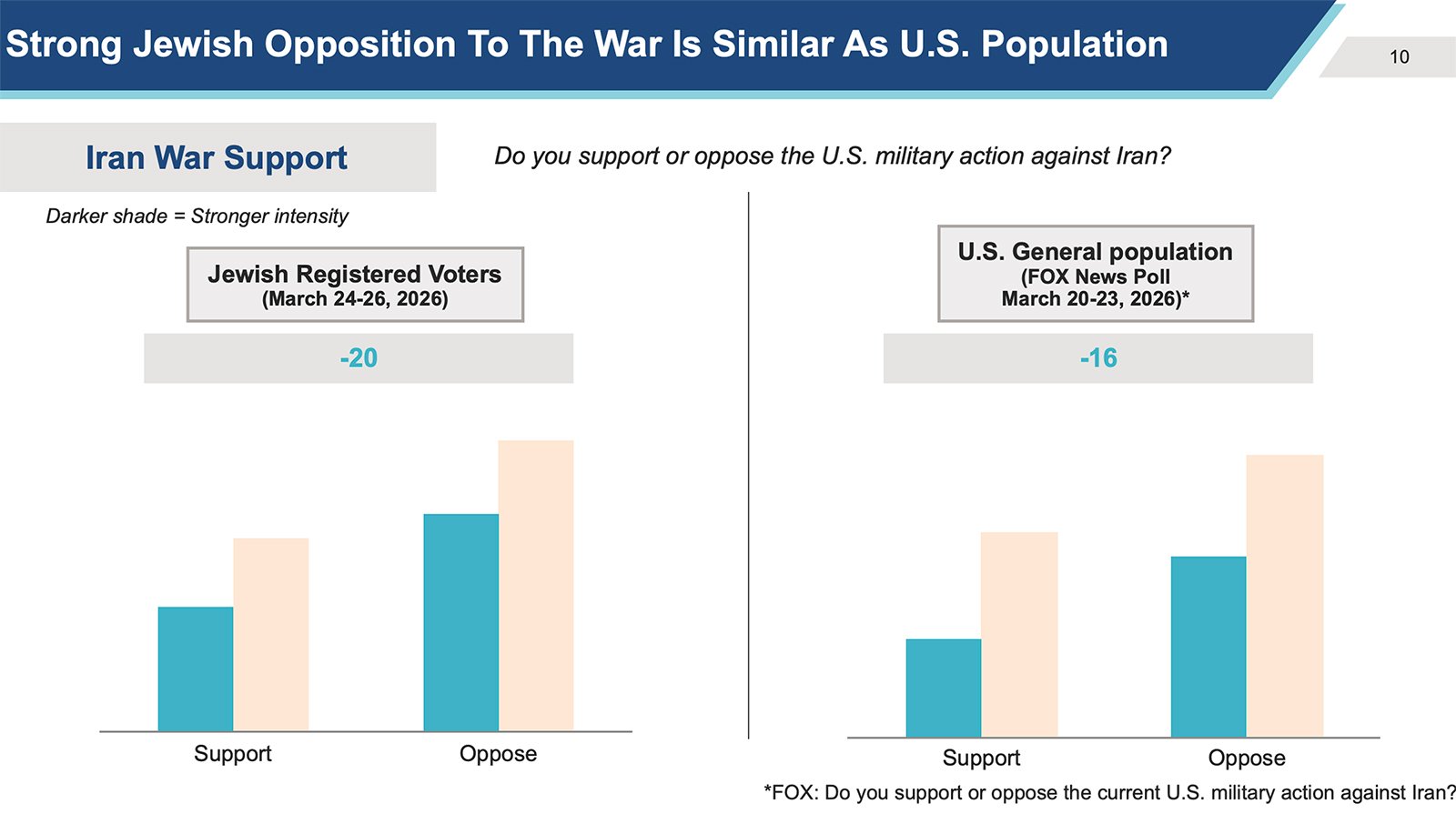Another poll of U.S. Jews, by the Jewish Electorate Institute, also released on Monday, showed similar results, with 55% of American Jews opposing military action against Iran. The two polls show that Jewish attitudes against the war are comparable to the opposition among all Americans (58% opposition in the Fox News poll conducted March 20-23).